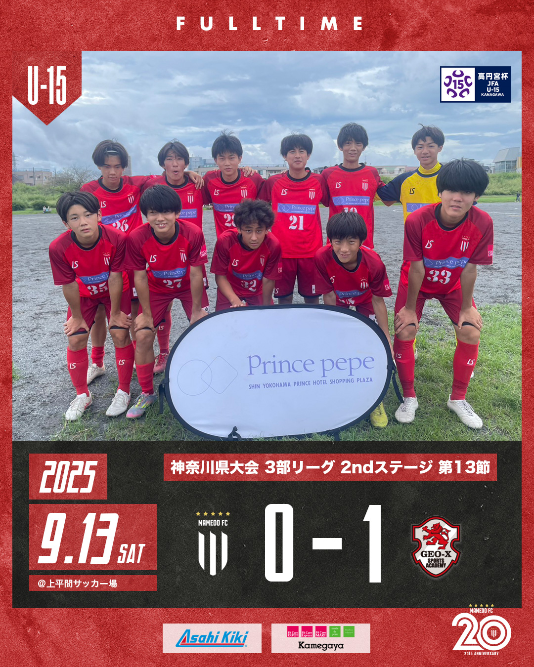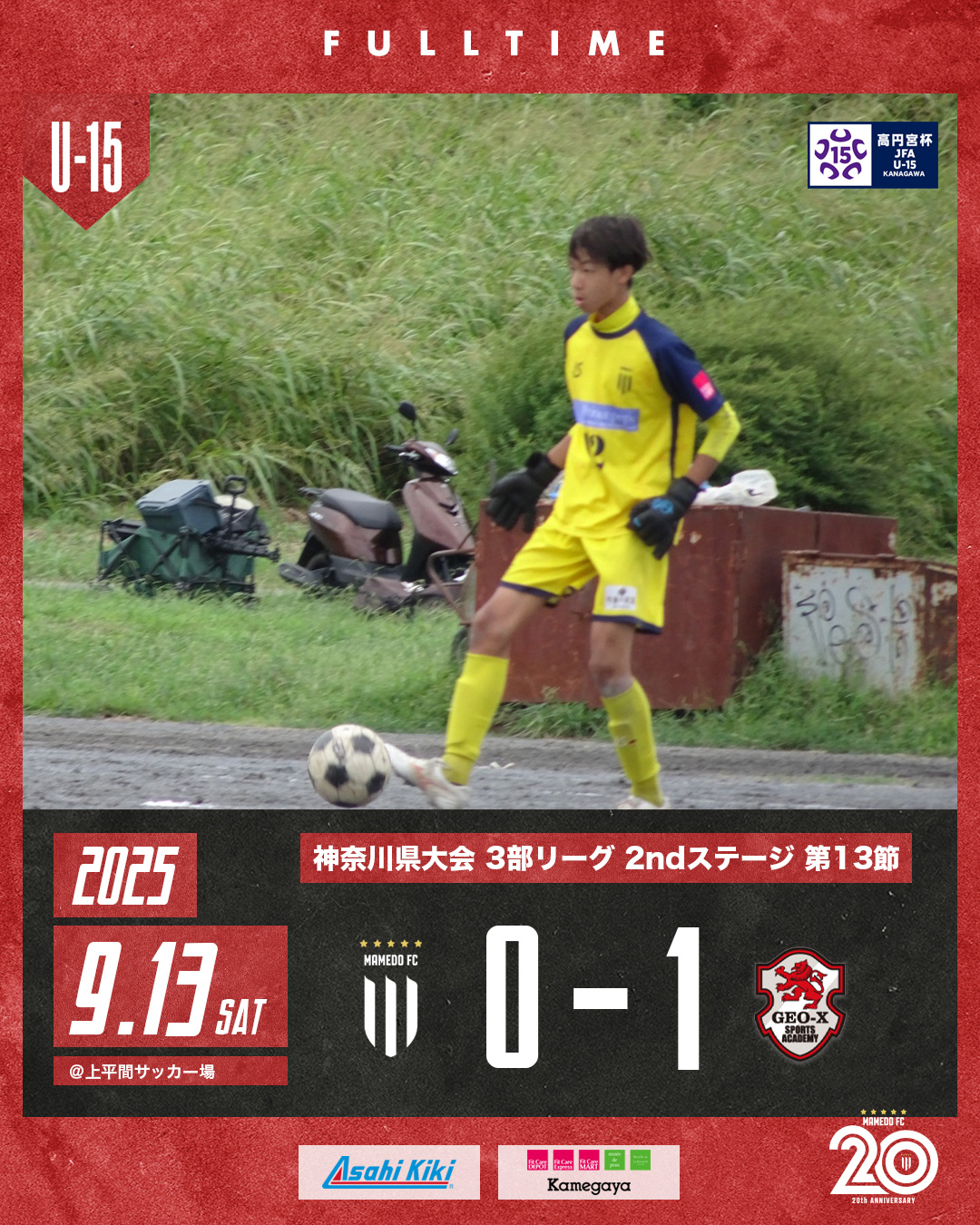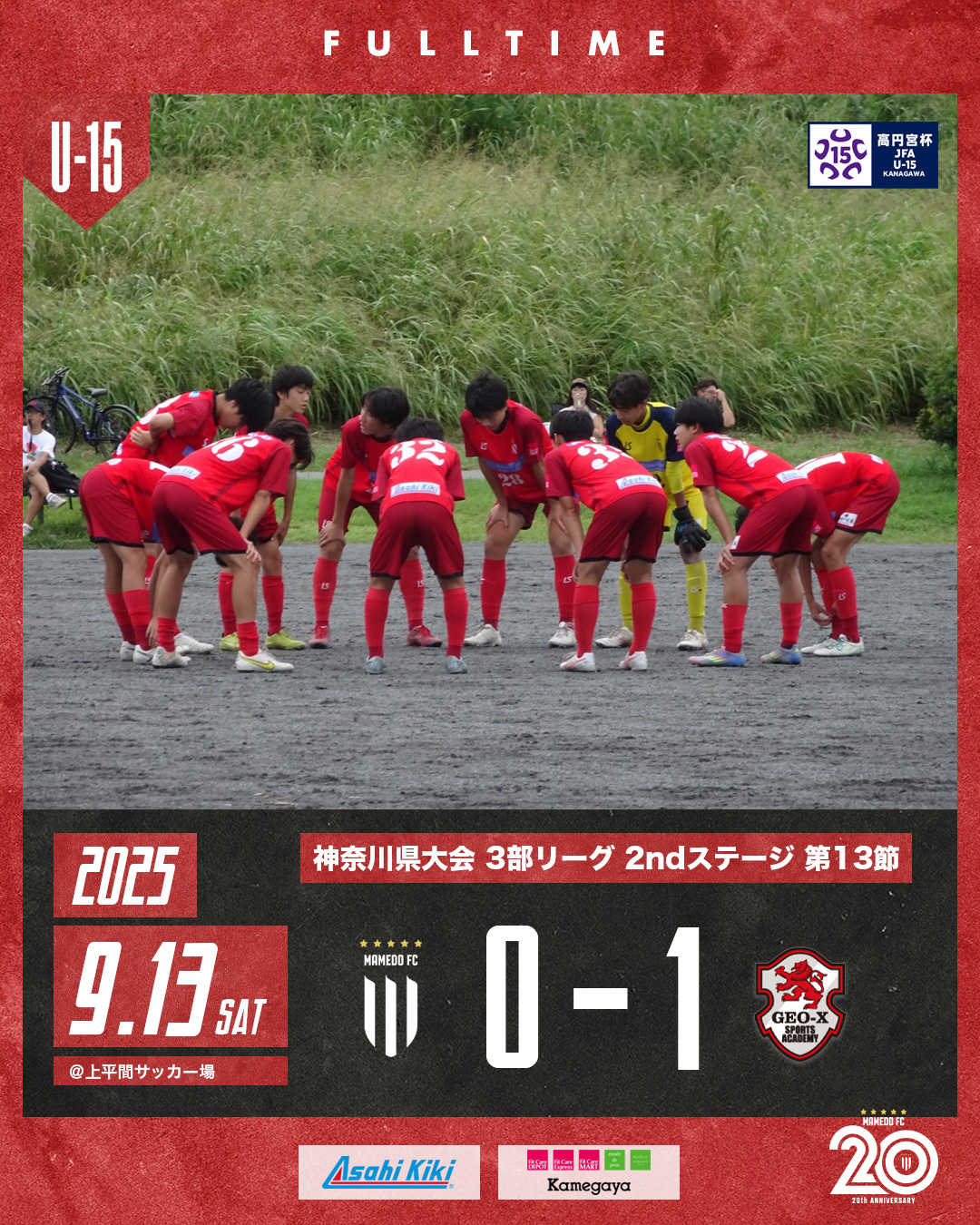 2025年9月13日 お知らせ U-15B 神奈川県リーグ 2025 3部 2ndステージ第13節 高円宮杯JFAU-15サッカーリーグ2025 神奈川県大会 3部 2ndステージ第13節 会場:上平間サッカー場 対戦相手:GEO-X FC 0-1 一瞬の隙を突かれ、失点ゴールを奪うゲーム。 どれだけ攻めていようと、ボールを、持っていようと最後はゴール。 ゴールに対する執着心と冷静さ! 日常を見直すきっかけに! mamedofc 12 Like