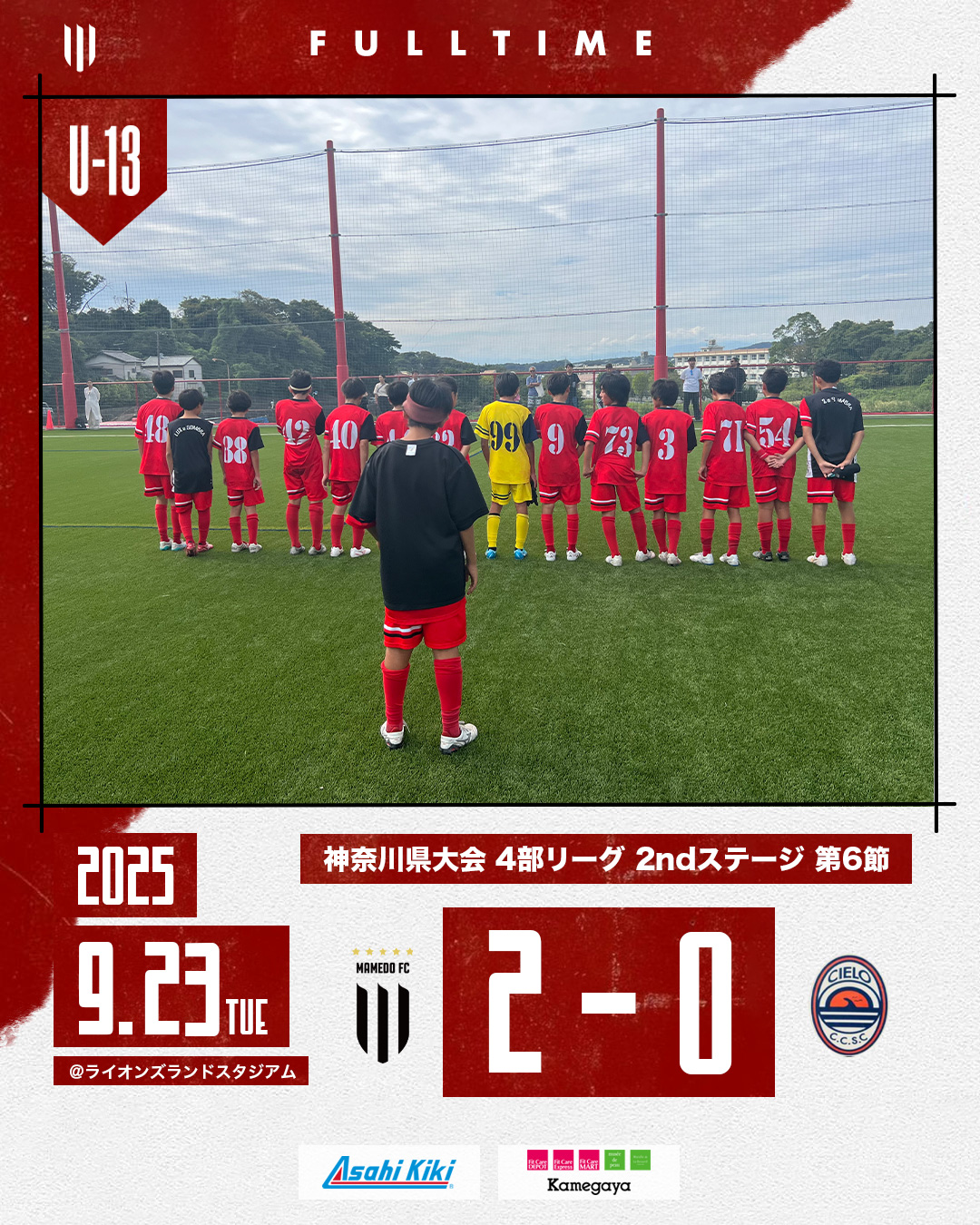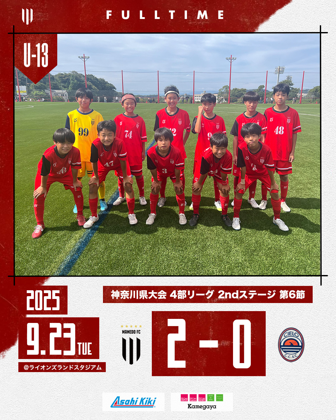 2025年9月23日 お知らせ U-13B 神奈川県リーグ 2025 4部 2ndステージ第6節 U-13 神奈川県リーグ2025 4部 2ndステージ第6節 会場:ライオンズランドスタジアム 対戦相手: FC CIELO スコア:2-0 得点者】小林(大豆戸FC)黒須(大豆戸FC) 前節と似た展開も今節は粘り強く戦い勝ち切りました! mamedofc 7 Like