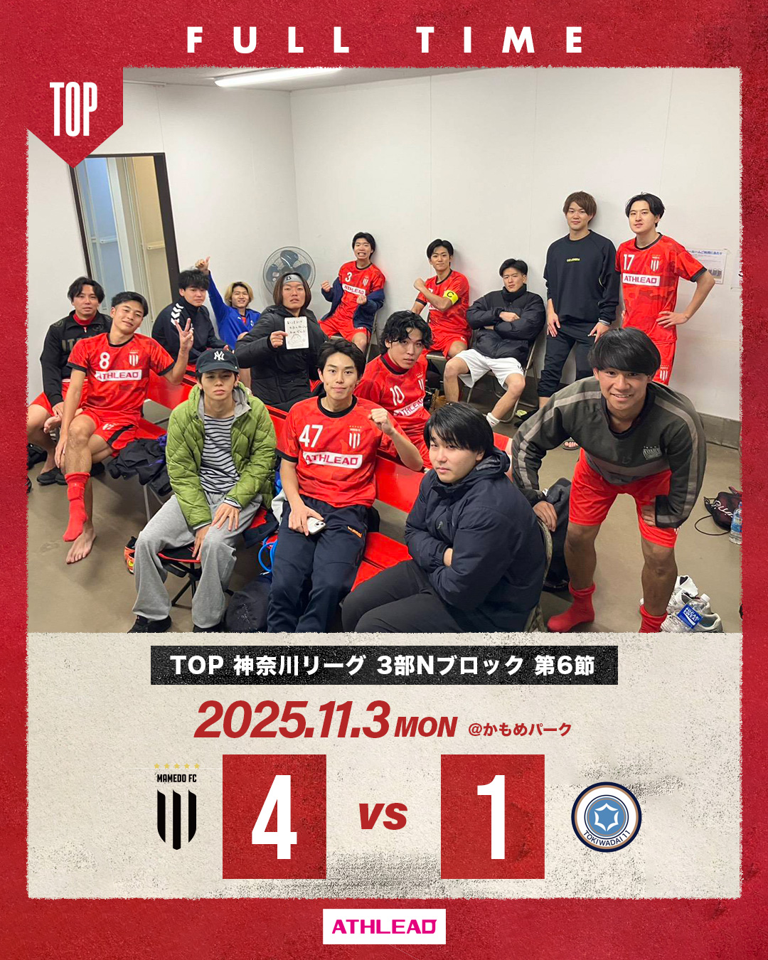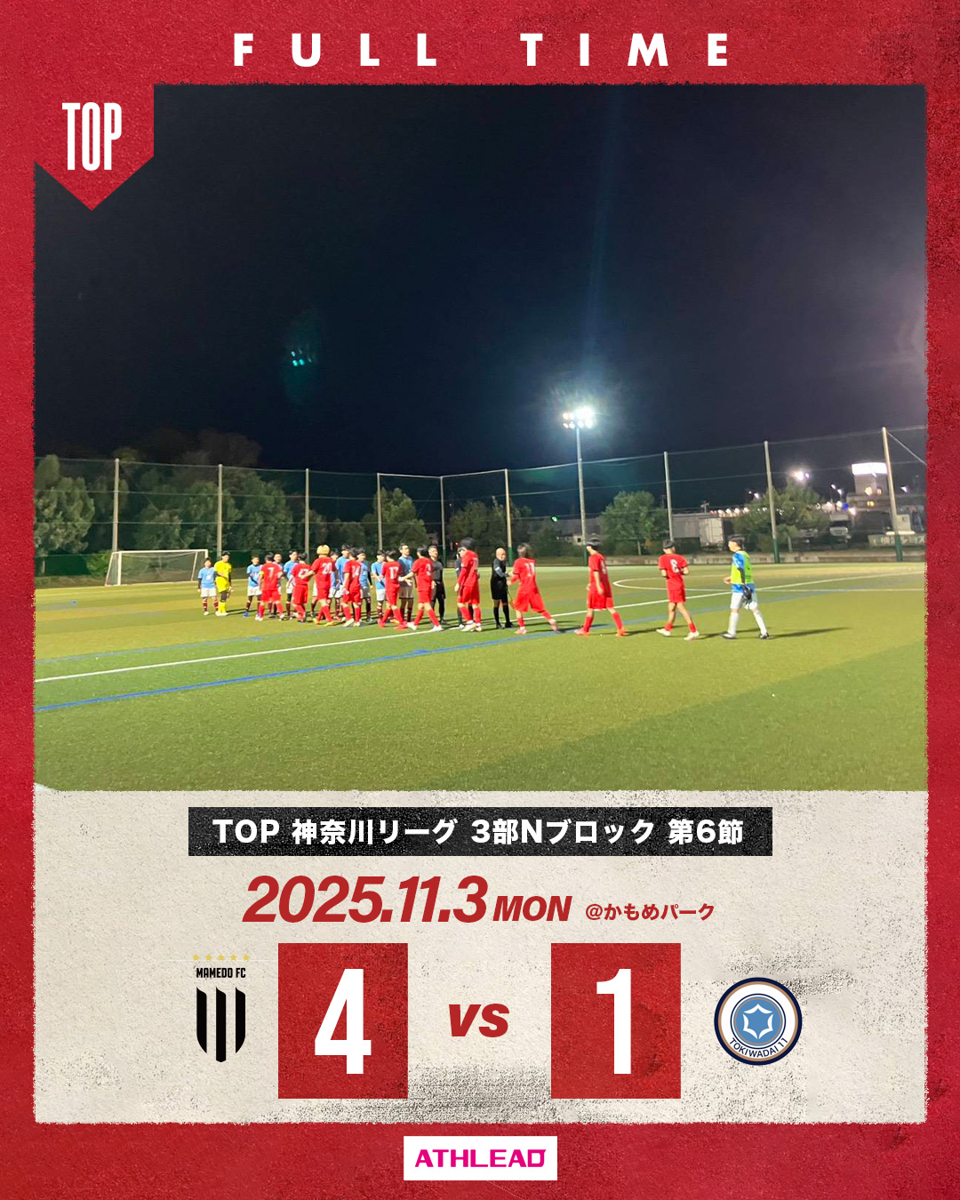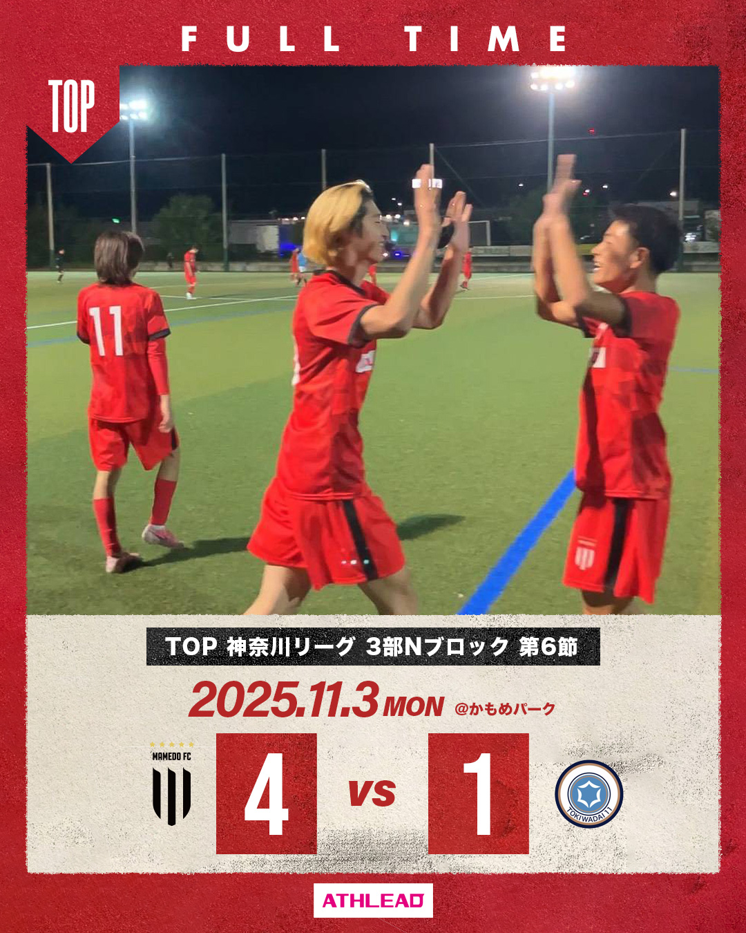 2025年11月4日 お知らせ TOP 神奈川県社会人サッカーリーグ3部 第6節 神奈川県社会人サッカーリーグ3部 第6節会場:かもめパーク 対戦相手:常盤台11 スコア:4-1 得点】長島、岡田、木村2 同点に追いつかれるも最後は引き離して勝利!次節勝利で昇格戦へ! mamedofc 4 Like