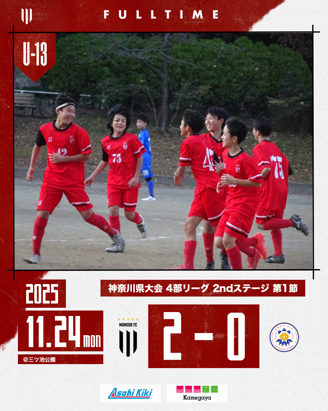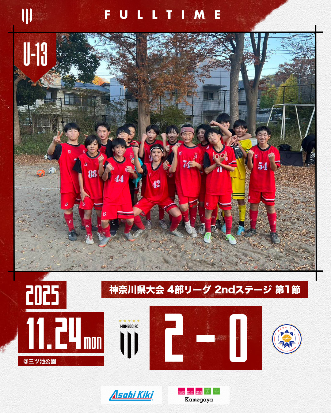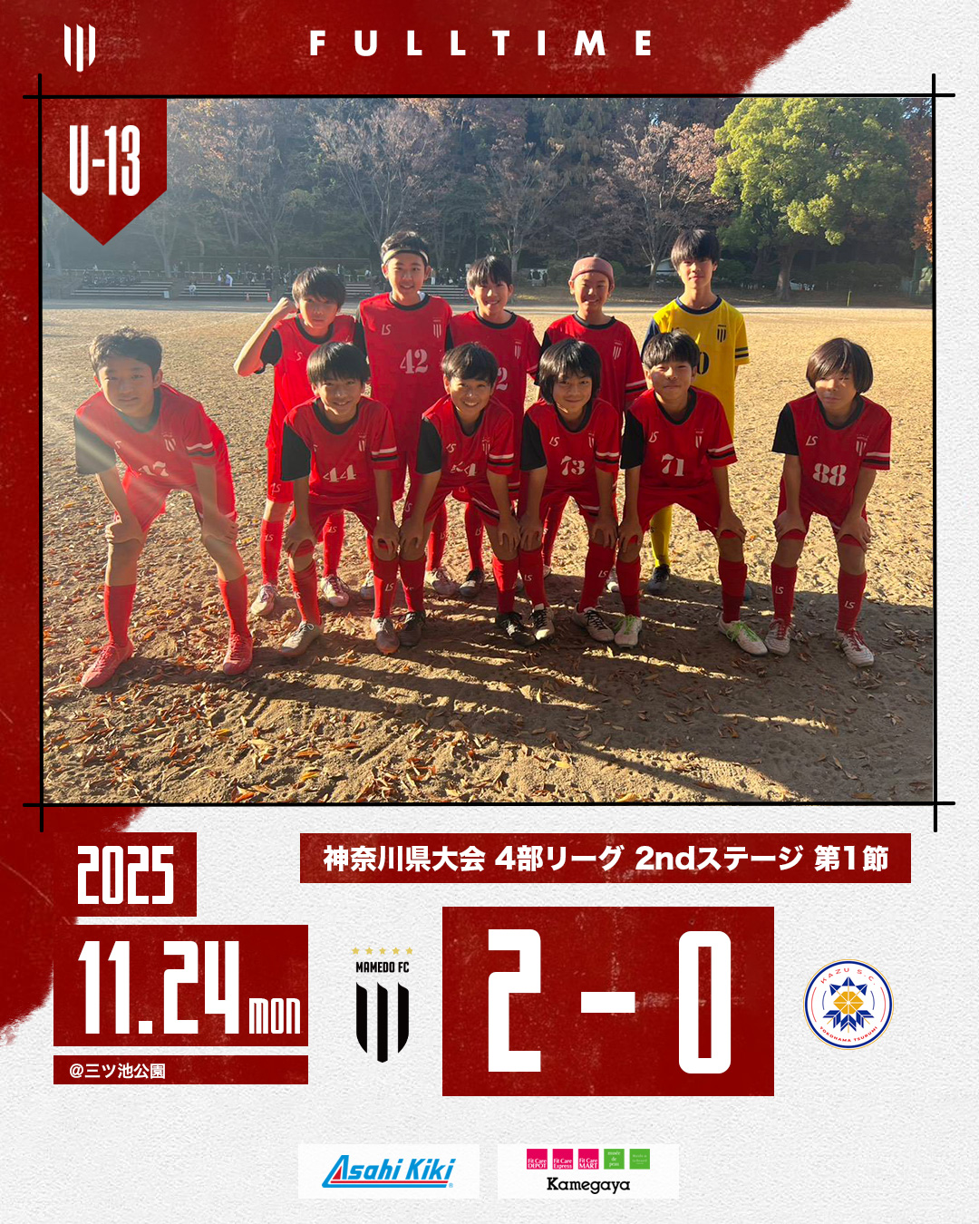 2025年11月24日 お知らせ U-13B 神奈川県リーグ 2025 4部 2ndステージ第1節 U-13B 神奈川県リーグ2025 4部 2ndステージ第1節 会場:三ツ池公園 対戦相手: KAZU SC BLUE スコア:2-0 後期リーグの初戦は幸先のいいスタートを切ることが出来ました!もっともっと高め合っていきましょう! mamedofc 7 Like