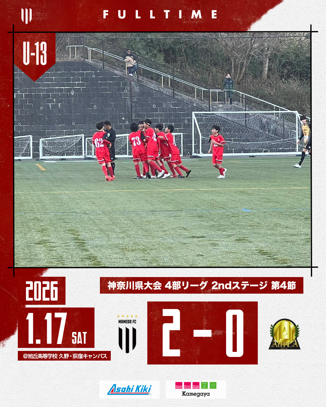 2026年1月17日 お知らせ U-13B 神奈川県リーグ 2025 4部 2ndステージ第4節 U-13B 神奈川県リーグ2025 4部 2ndステージ第4節 会場:旭丘高等学校 久野・荻窪キャンパス 対戦相手: AUREA スコア:2-0 首位決戦での勝利で昇格に向けた大きな一歩!残り2試合! mamedofc 7 Like