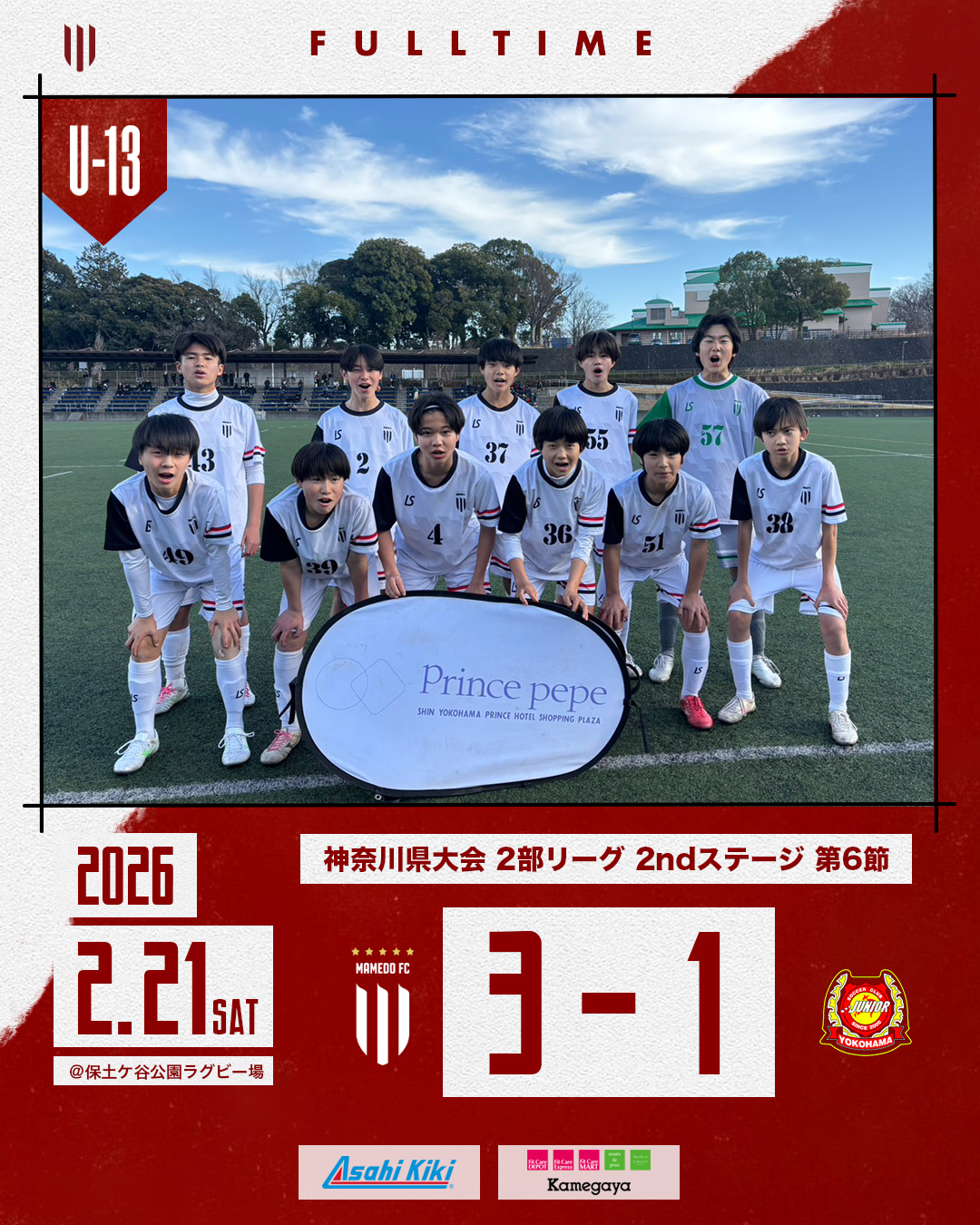 2026年2月21日 お知らせ U-13A 神奈川県リーグ 2025 2部 2ndステージ第6節 U-13A 神奈川県リーグ 2025 2部 2ndステージ第6節 会場:保土ケ谷公園ラグビー場 対戦相手:横浜ジュニオール スコア:3-1 得点】辻(東住吉)林いぶき(青葉)平田(鶴見東) 勝たないと昇格が消える試合。 残り15分からの逆転劇! 残り1節、勝利と、一部復帰を狙います! mamedofc 15 Like