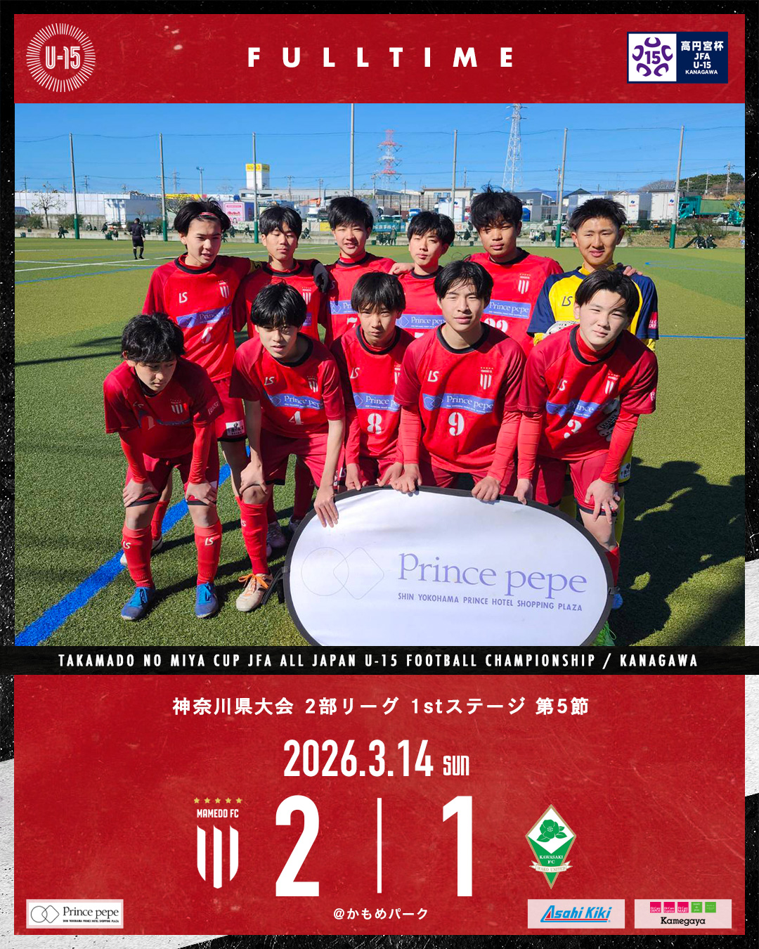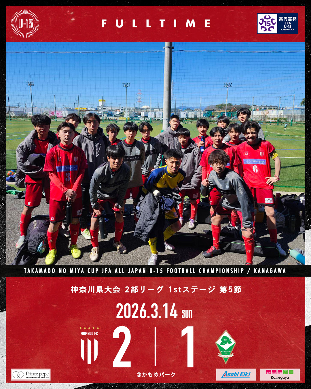 2026年3月14日 お知らせ U-15A 神奈川県リーグ 2026 2部 1stステージ第5節 高円宮杯JFAU-15サッカーリーグ2026 神奈川県大会 2部 1stステージ第5節 会場:かもめパーク 対戦相手:和光ユナイテッド川崎 スコア:2-1 終了間際に勝ち越し何とか勝ち点3を取りました! 次節もしっかり積み上げられるように準備します。 mamedofc 1 Like